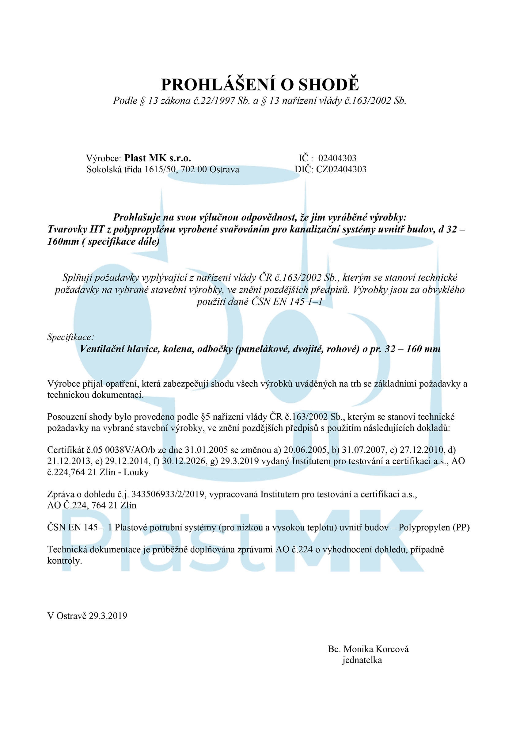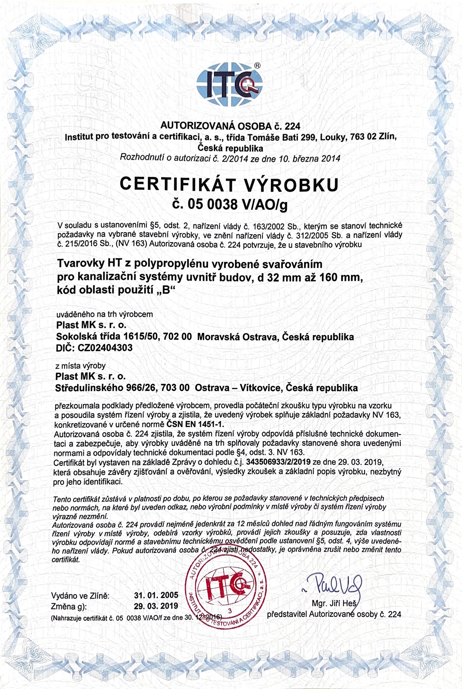 - HT PP tvarovky a trubky splňují požadavky normy ČSN EN 1451-1, což je pravidelně ověřováno Autorizovanou osobou č. 224 ITC Zlín.